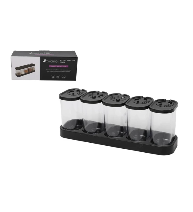 סט 5 צנצנות לתבלינים עם מעמד-שחור.