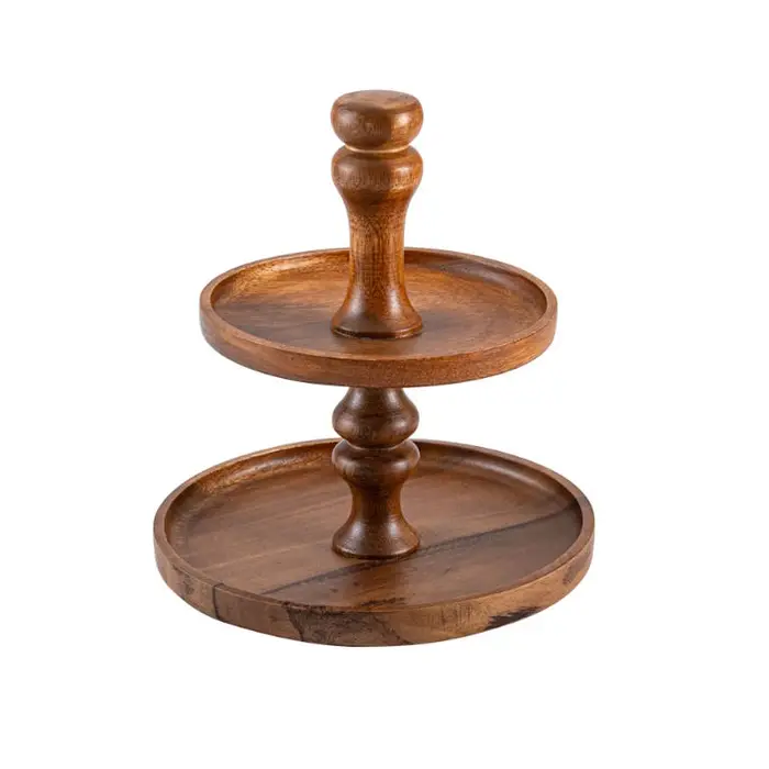 עשוי עץ מלא בגוון עשיר וטקסטורה טבעית, עם שתי קומות עגולות המופרדות עם ידית מעוצבת לאחיזה נוחה. העיצוב המדורג מאפשר להציג בצורה מרשימה מיני מאפים, פרלינים, פירות חתוכים, פיצוחים או כל תוספת קטנה שתרצו להגיש בסטייל. הגובה בין המפלסים מעניק ניצול חכם של שטח ההגשה והופך את הסטנד לאידיאלי לאירוח, שולחנות מתוקים, בופה, או פשוט כפריט דקורטיבי מעוצב במטבח.