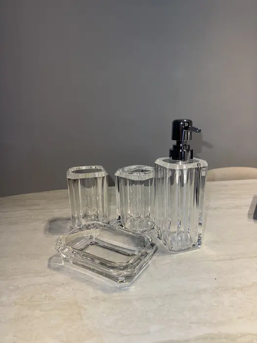הסט כולל בקבוק לסבון 2 כוסות למברשות שיניים ומגש קטן לסבון